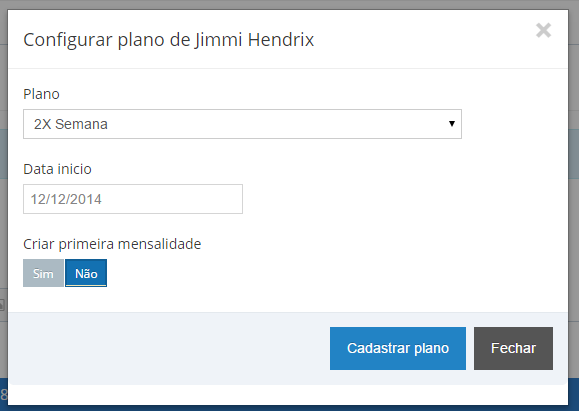 Na tela que abrir, escolha: Plano, Data início e se deseja criar primeira mensalidade. Para finalizar, clique em 'Cadastrar plano', conforme imagem abaixo: