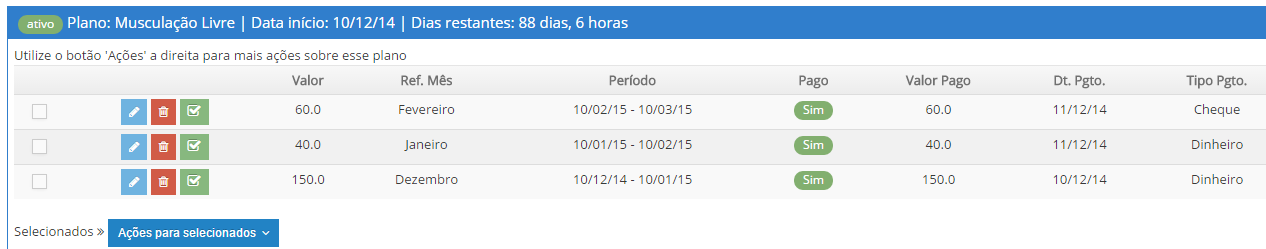- Fique atento aos dias restantes do cliente na parte superior da caixa do plano do cliente. Essa quantidade é o que determina se o cliente terá acesso a academia ou não por pagamento da mensalidade. Se você ver 0 dias, o cliente será bloqueado por falta de pagamento.