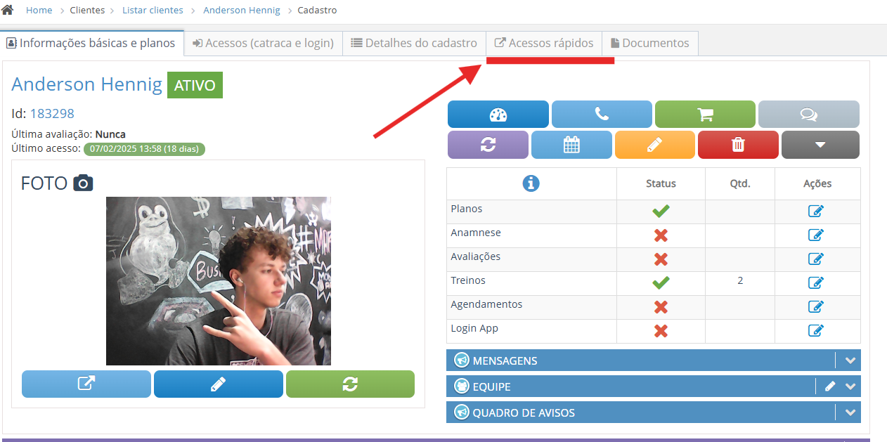 1. Abra o cadastro do cliente que você deseja gerar o contrato e clique em "Acessos rápidos";