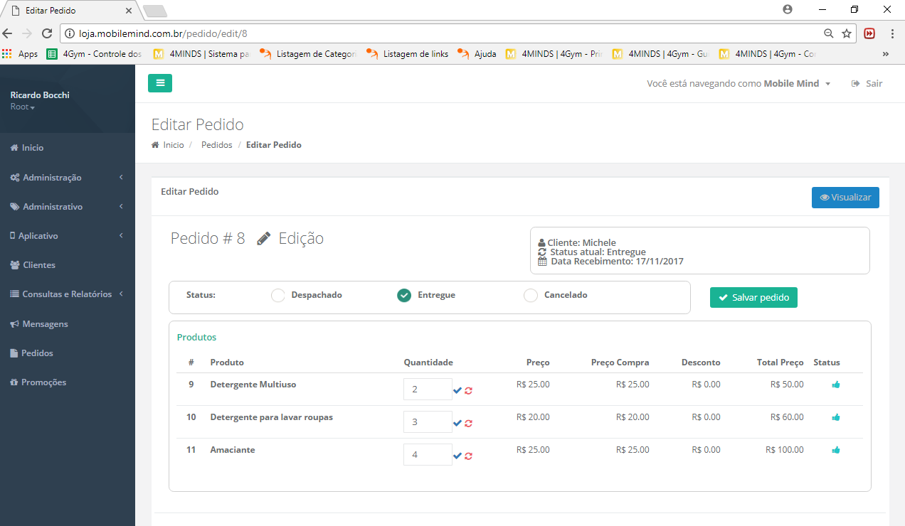 - Despachado: quando o pedido já saiu a caminho para a entrega. O cliente receberá uma noticação iformando a entrega assim que esse status for informado.