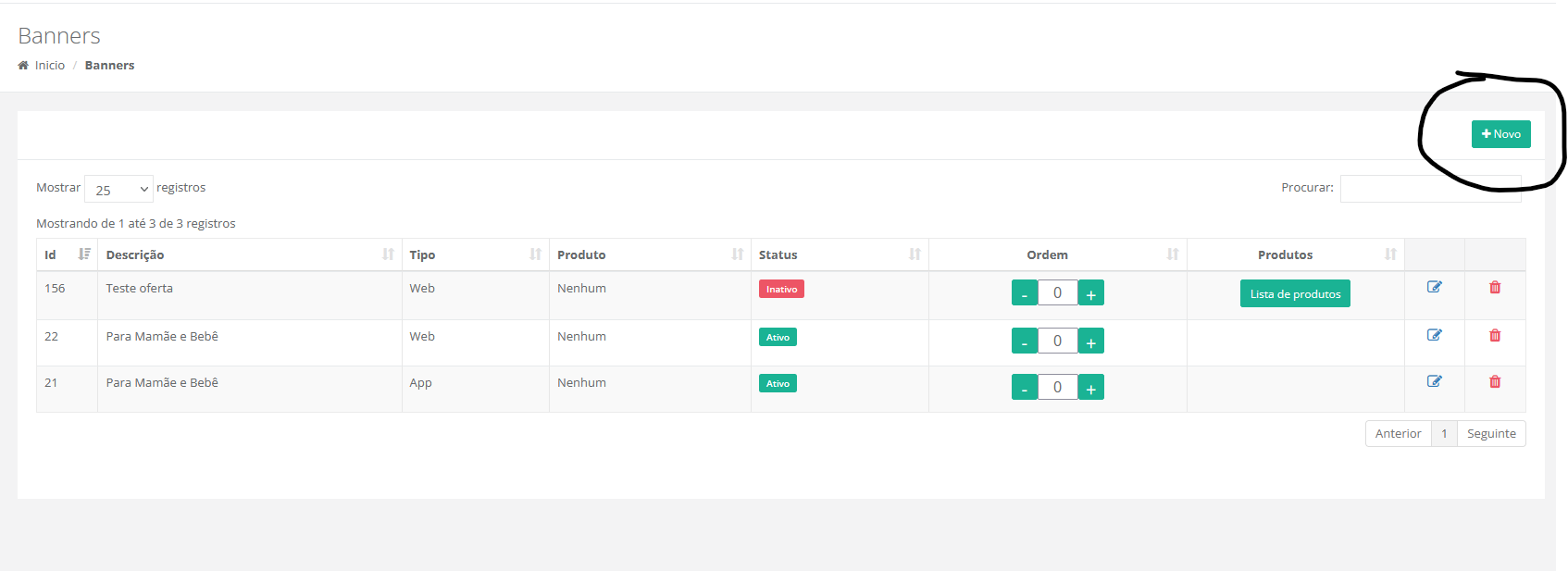 - Na tela Banners o usuário pode ver uma listagem dos banners já criados anteriormente. Se deseja cadastrar um novo banner, clique em "Novo";