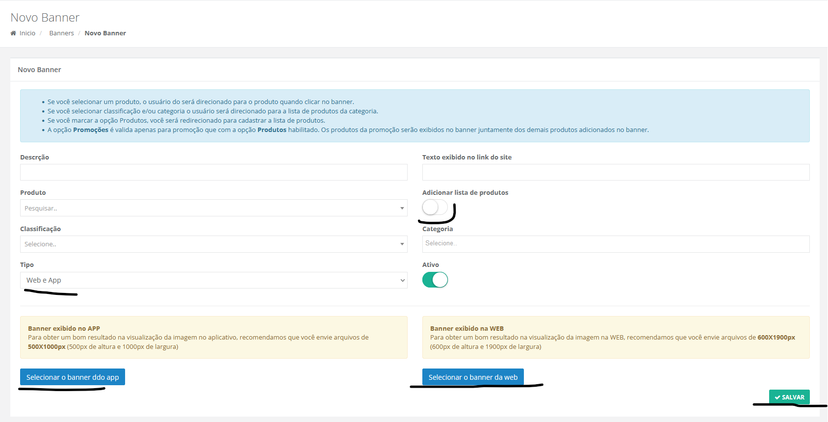 - Na tela abaixo pode-se criar: "Descrição" que será o título do banner; "Produto" para selecionar o produto a qual o banner direcionará; "Classificação" para selecionar a classificação de produto a qual o banner direcionará (usado quando deseja associar mais de um produto a um mesmo banner); "Tipo" para selecionar se o banner aparecerá no site, app ou em ambos; "Adicionar lista de produtos" para selecionar vários produtos a qual o banner direcionará (podem ser selecionados ao clicar em "Salvar" e passar para a próxima tela); em "Selecionar o banner do app" e "Selecionar o banner da web" pode-se enviar a imagem que será vista no site (aconselhável obedecer a altura e largura sugerida). Após preencher os campos que deseja, prossiga clicando em "Salvar".