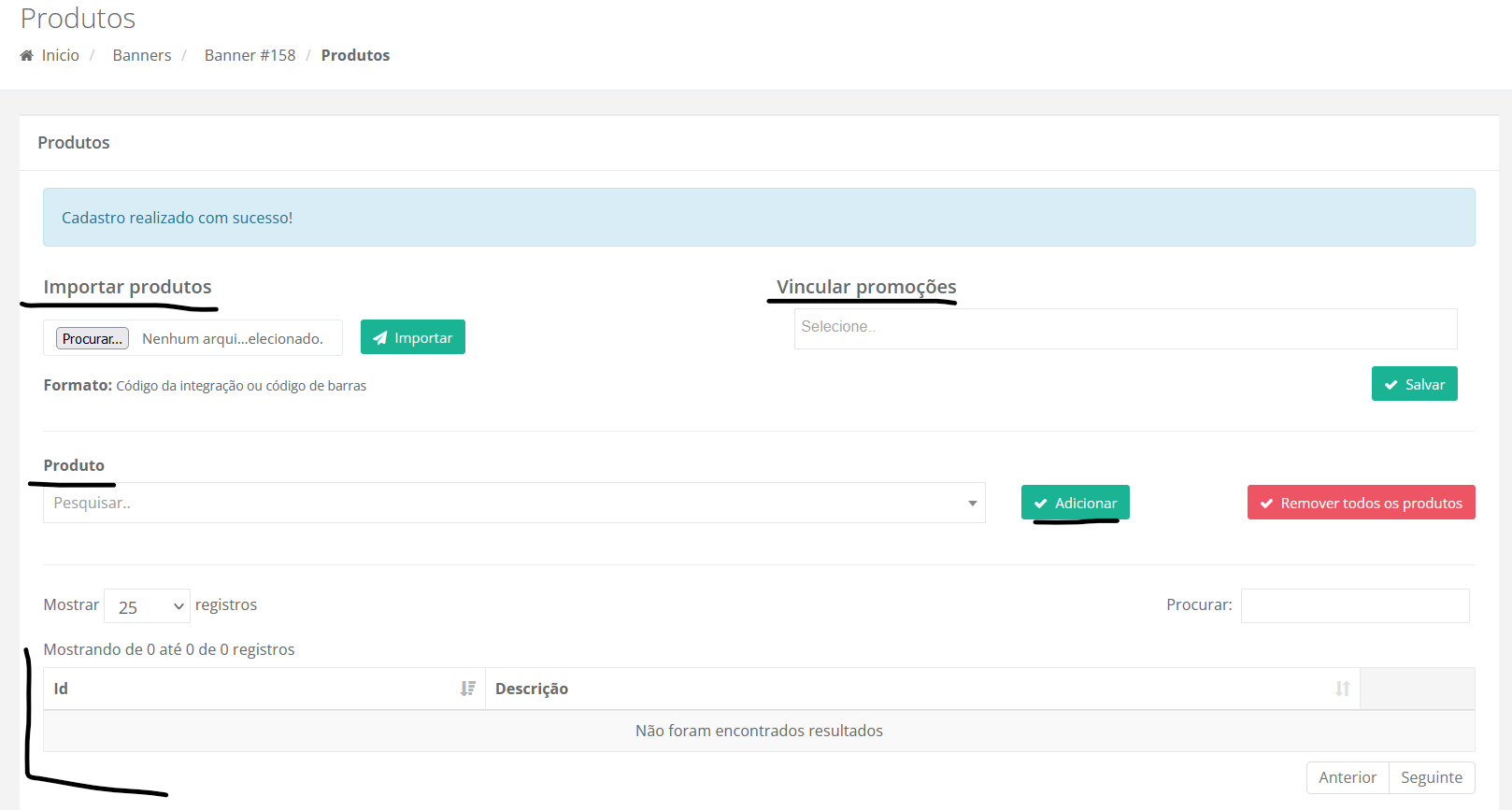 - Nessa tela é possível importar os produtos através de um documento do computador (o arquivo deve ter os códigos separados por vírgula). Na opção "Vincular promoçoes" é possível vincular uma promoção que estará aplicada ao produtos exibidos pelo banner. Logo abaixo é possível selecionar produto por produto e clicar em "Adicionar", os produtos adicionados serão exibidos na listagem.