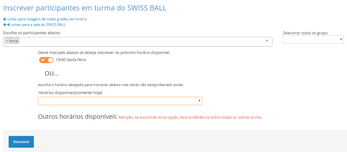 Há duas formas de cadastrar inscrições nas grades de horário: (1) pelo sistema, (2) o participante se inscreve pela internet, pelo aplicativo 4GYM que ele pode baixar no celular.
