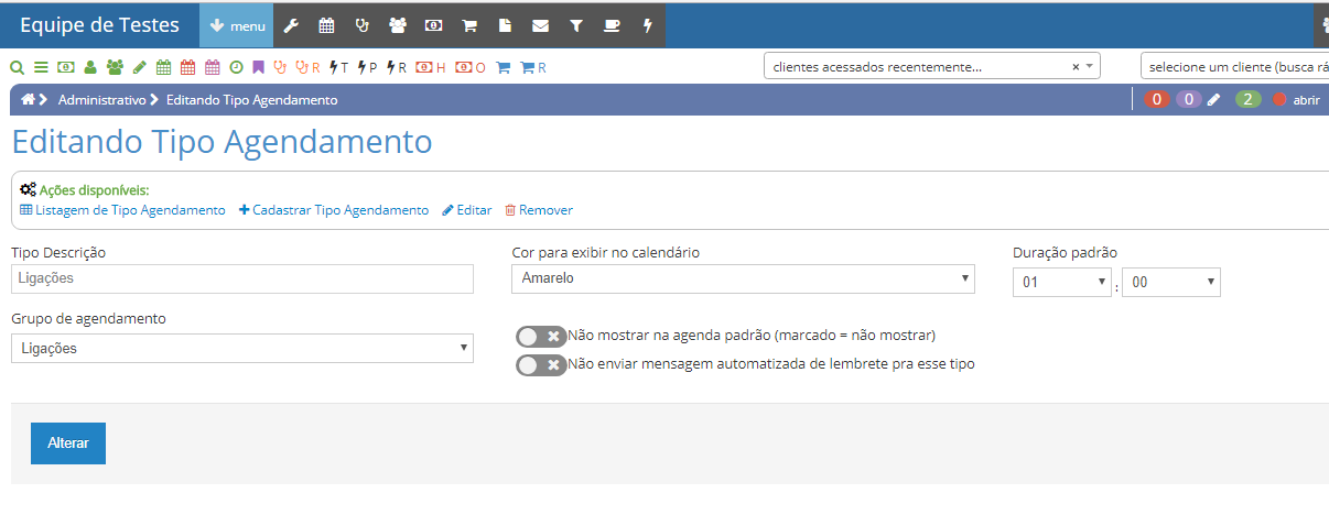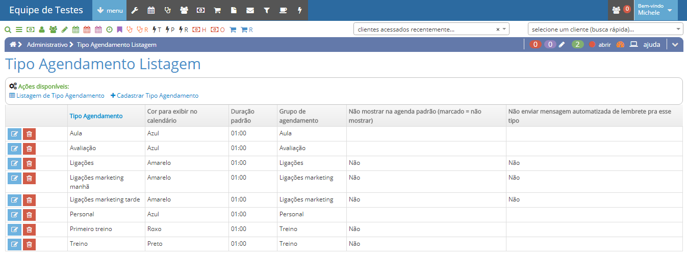 Para poder cadastrar as agendas personalizadas, é necessário que seja cadastrado tipos de agendamento. Por padrão, o sistema vem com tipos cadastrados, para acessar essa listagem vá em MENU -> ADMINISTRATIVO -> CADASTROS -> TIPO DE AGENDAMENTO.