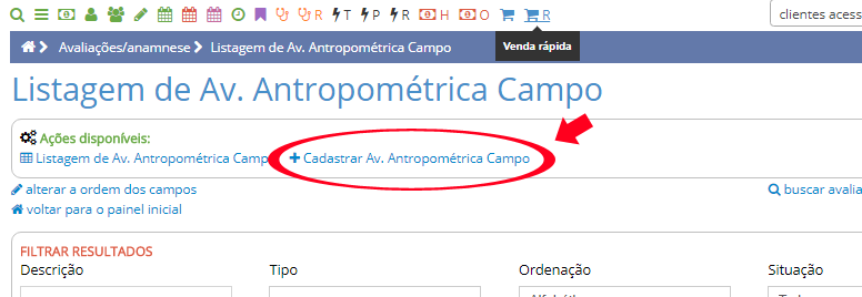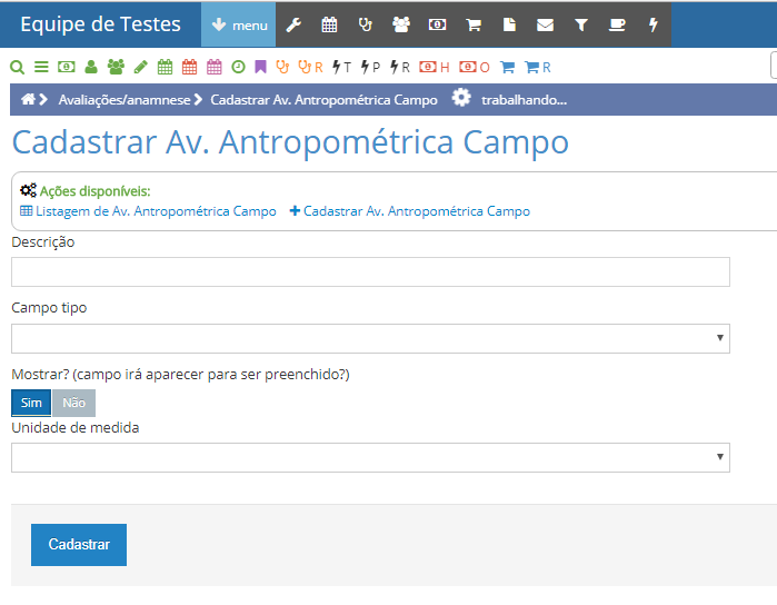 Clique na opção CADASTRAR AV. ANTROPOMÉTRICA CAMPO.
