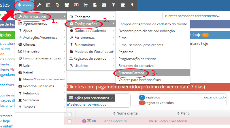 Para editar alguma configuração, primeiro você deve acessar a listagem onde são exibidas todas as configurações, vá em MENU -> ADMINISTRATIVO -> CONFIGURAÇÕES -> SISTEMA/CATRACA.