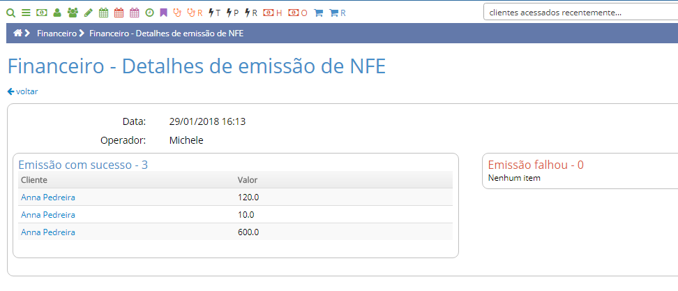 Na próxima tela aparecerá a emissão da NFE, conforme os nomes dos alunos que foi selecionado.