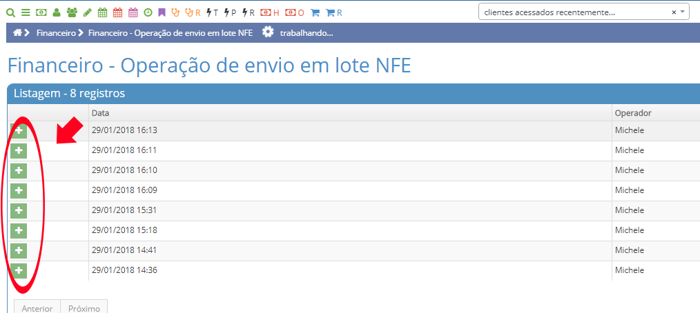 Aparecerá uma listagem com as operações, clique no "mais" para saber mais detalhes sobre a emissão das notas, como mostra a flecha na imagem abaixo.