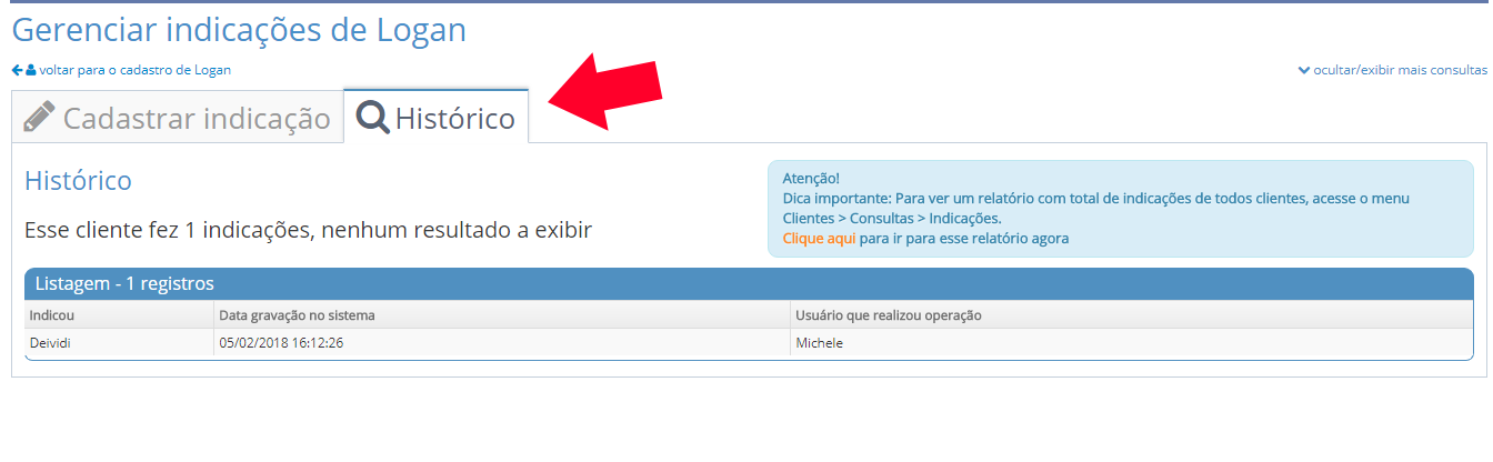 Para saber o histórico de indicações desse aluno, é só clicar em HISTÓRICO, como mostra a imagem: