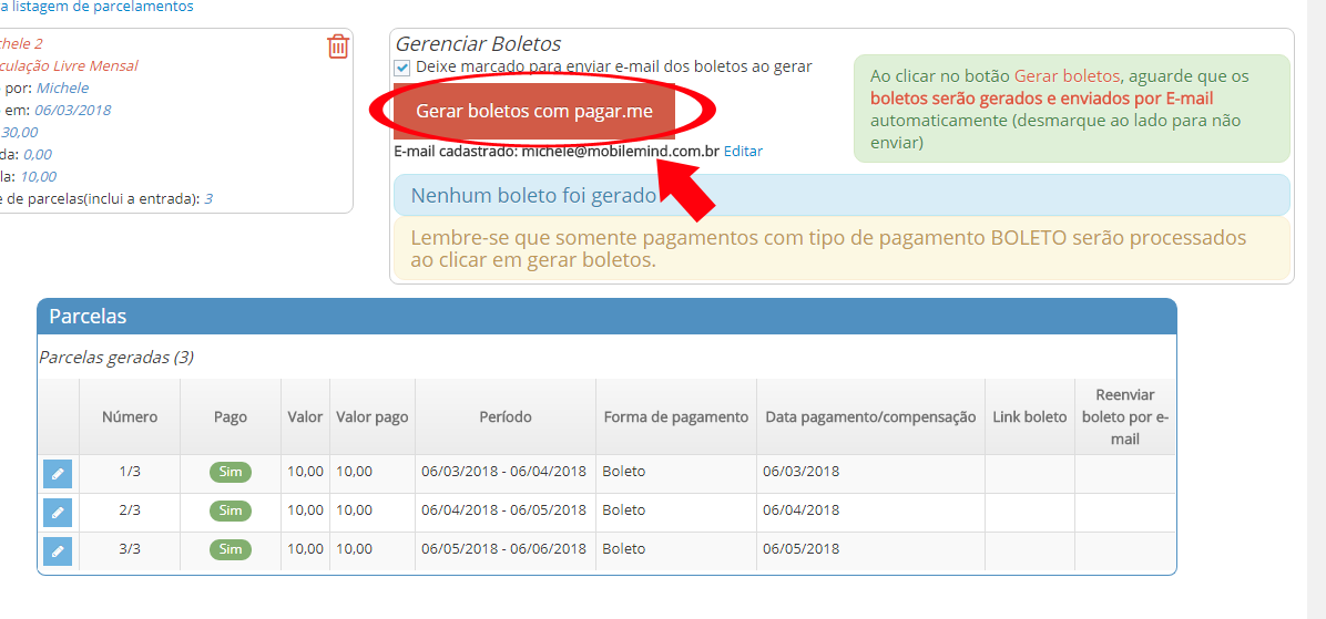 Passo 1 - Na tela de visualização do parcelamento, clique em GERAR BOLETOS COM PAGAR.ME -> SIM, CONTINUAR.