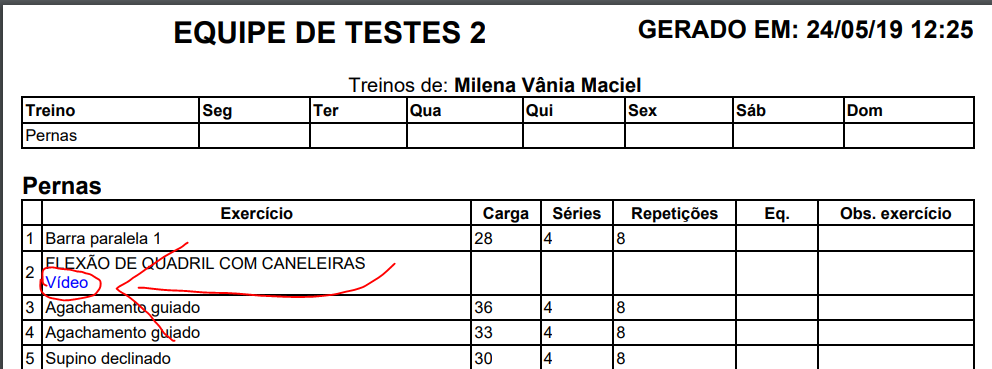 Através dessa janela então, o treino será preparado com os links aparecendo na impressão formato PDF, e o aluno pode abrir pelo celular os links. Veja exemplo abaixo: