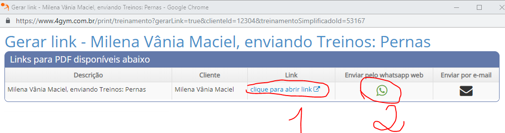 Quando for usar a opção Gerar link e enviar pelo WhatsApp Web no treino, a impressão será gerada com links pro aluno abrir vídeo e imagem pelo dispositivo que ele abrir o PDF, provavelmente o celular.