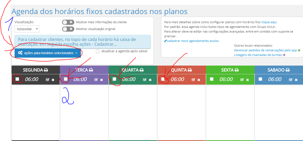 No número 2, repare que existe caixas de marcação em cima de cada horário, pra marcar e em seguida invocar ações do menu acima.