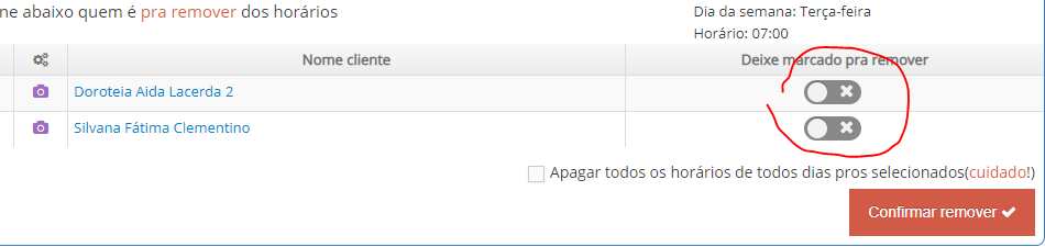 Pra realizar essa operação, acima de cada horário existe o ícone de x, que serve pra remover clientes daquele horário, veja imagem abaixo: