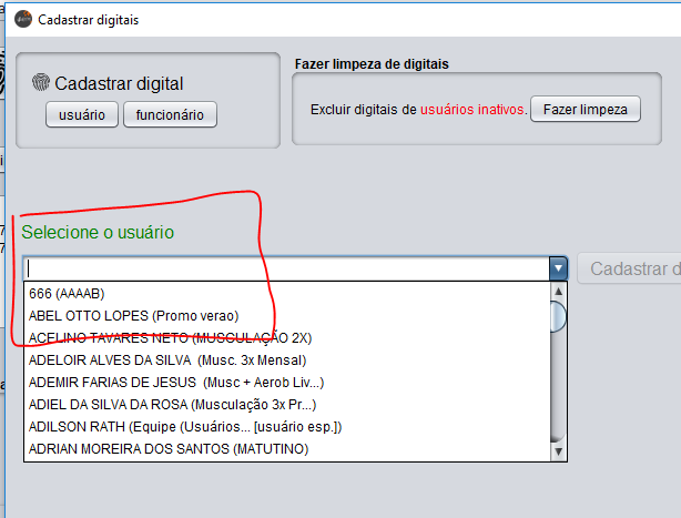 IMPORTANTE: Nessa caixa de seleção irá aparecer 2 tipos de cadastros: (1)clientes e (2)usuários especiais cadastrados pelo menu Secretaria > Gerenciamento interno > Usuários especiais.