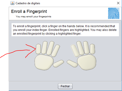 Passo 4 - Uma tela auxiliar irá abrir, clique no dedo desejado que irá cadastrar, veja imagem: