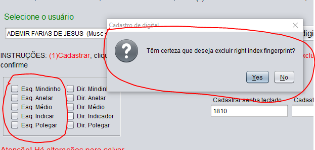 Pra excluir digital, siga os mesmos passos como se fosse cadastrar a digital e após selecionar o usuário, não clique em Cadastrar digital. Veja mais abaixo onde há 10 caixas de marcação que representam os dedos. Clique para desmarcar o item e o sistema irá pedir se deseja excluir aquela digital. Confirme e aguarde confirmação.