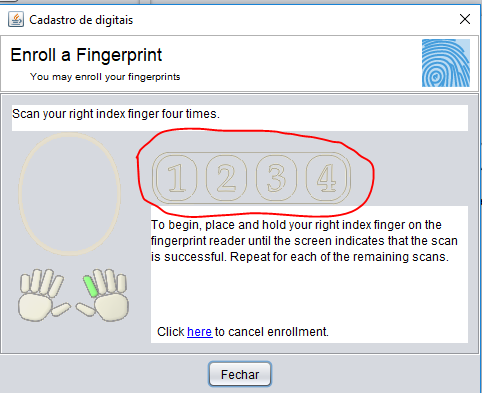 Passo 5 - Na tela auxiliar que irá abrir, deve ser feito 4 leituras do dedo, cada leitura com sucesso irá deixar o número em azul, faça todas as 4 e quando concluído, clique em Fechar. Irá retornar pra tela de seleção do usuário e irá salvar automaticamente as alterações.