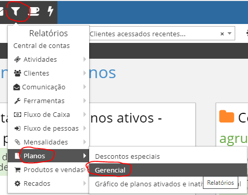 Passo 1 - Abrir opção de menu Relatórios > Planos > Gerencial, veja imagem abaixo: