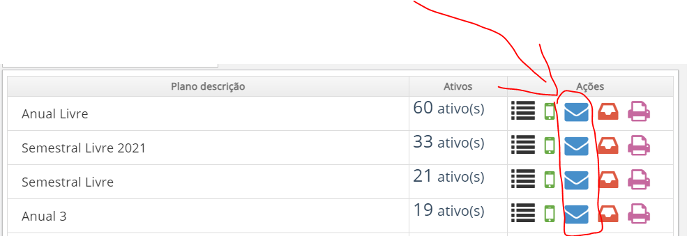 Para iniciar envio de e-mail para os ativos no seu plano desejado, localize e clique no botão de envelope azul, veja imagem abaixo: