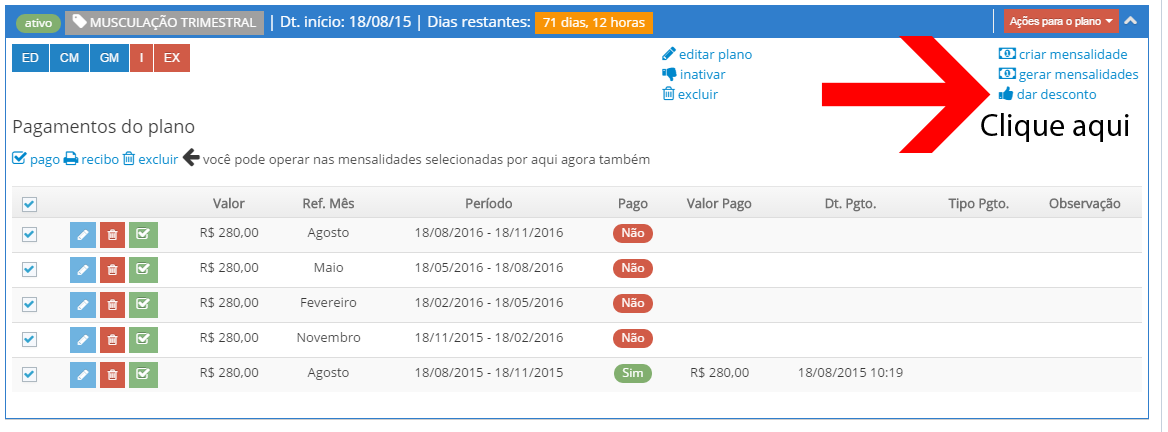Agora quando uma mensalidade for gerada ou criada, o desconto será aplicado. No plano com desconto, uma mensagem irá aparecer indicando que alguém deu desconto. Por exemplo, um plano com valor R$ 110, com desconto de R$ 30 a mensalidade será de R$80.