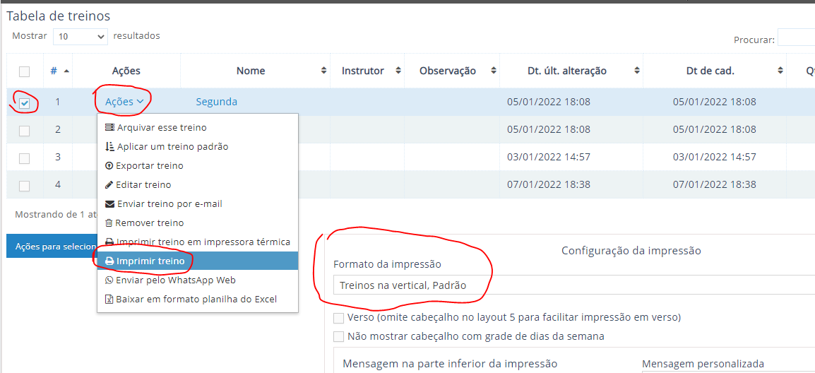 Repare mais a direita da tela a caixa de seleção Formato da impressão. Ali há outros formatos, experimente alterar e ativar a função Imprimir treino novamente.