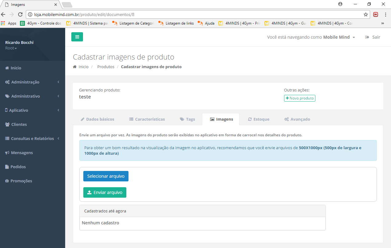 Na aba "Imagens" você pode adicionar imagems do produto para facilitar a visibilidade no aplicativo.