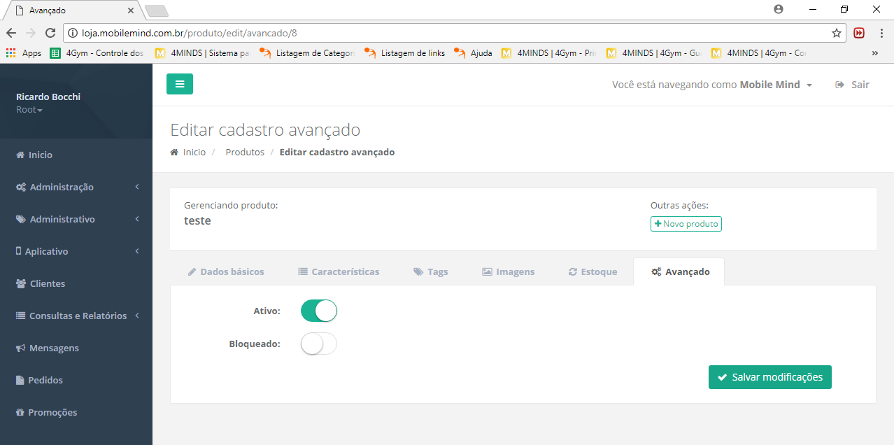 Caso precise desativar o produto vá na aba "Avançado". Produtos inativos ou bloqueados não ficam disponíveis para a venda no aplicativo.