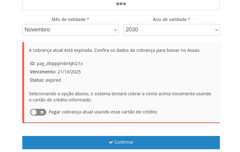 - Na opção de trocar o cartão, que pode ser o mesmo cartão, vai ter uma opção para tentar cobrar a parcela atual (que é a parcela que o Asaas não conseguiu cobrar). É sempre bom verificar se os dados estão corretos;