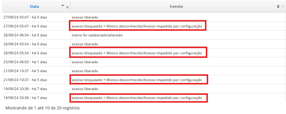 - A mensagem de bloqueio do aluno "Motivo desconhecido/acesso impedido por configuração" aparece frequentemente nos relatos de suporte do 4Gym. Para identificá-la basta entrar no histórico do aluno, por meio da tela de cadastro do aluno;