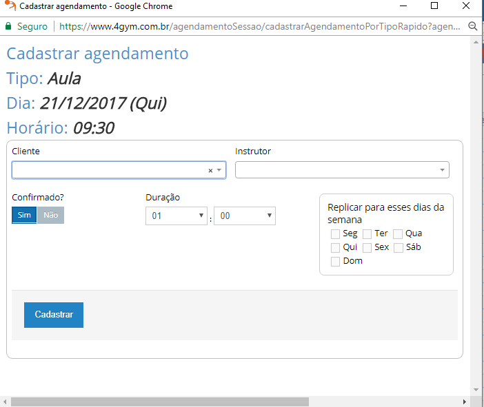 Para cadastrar um agendamento, clique numa área da agenda que representa o dia e horário desejado, abrirá uma nova tela com as opções, após a escolha clique em CADASTRAR. Repare que a agenda evolui em intervalos de 30 minutos. Deverá abrir uma tela de cadastro como abaixo: