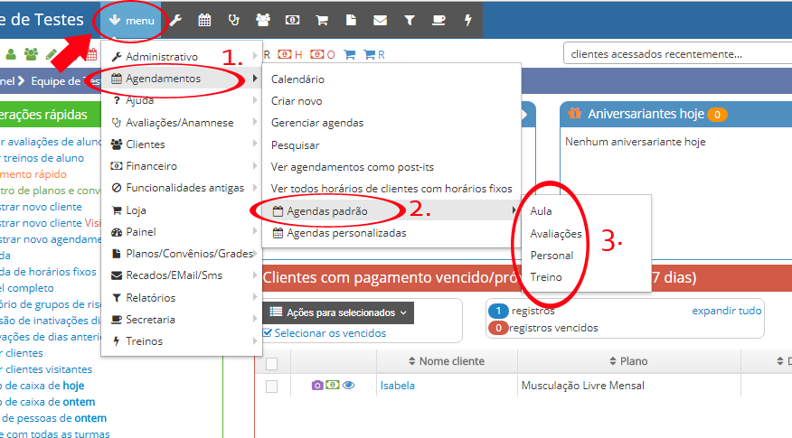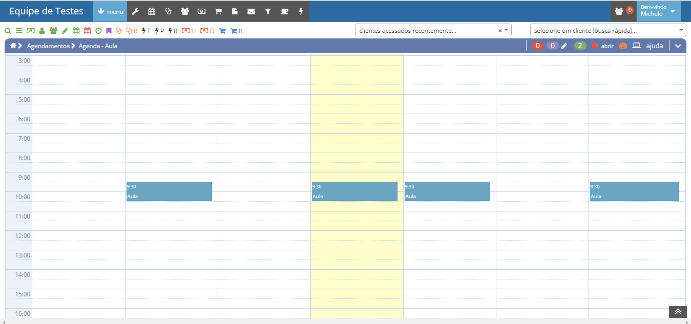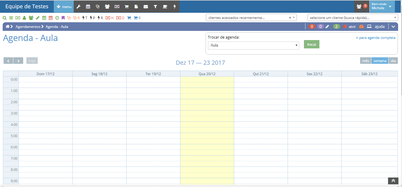 Para acessar essa agenda vá em MENU -> AGENDAMENTOS -> AGENDAS. Perceba que existe várias opções, nesse exemplo iremos usar a categoria AULA como exemplo.