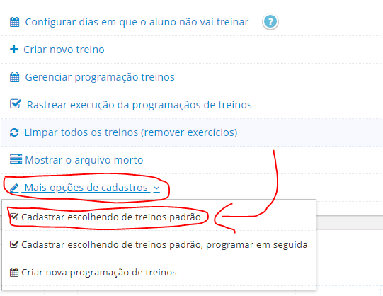 Passo 2 - Na tela de treinos, clique em MAIS OPÇÕES DE CADASTROS -> CADASTRAR ESCOLHENDO DE TREINOS PADRÃO: