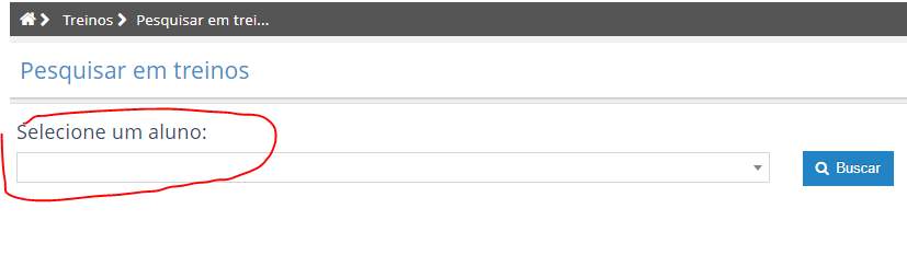 Acesse menu Treinos > Buscar treinos de aluno e selecione o nome de cadastro desejado, veja imagem abaixo: