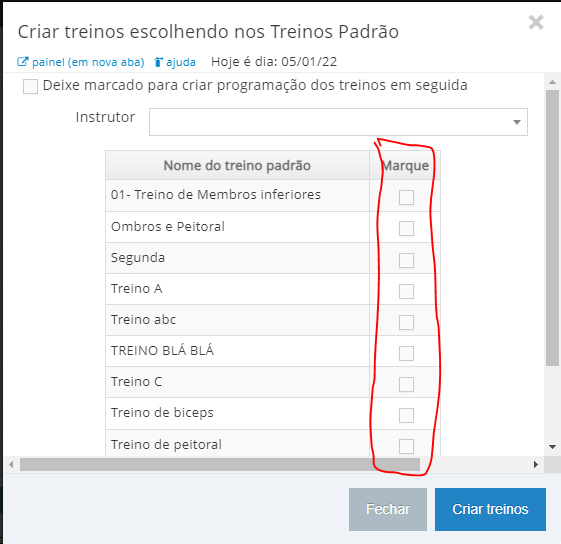 Janela auxiliar irá aparecer, marque os treinos padrão desejados.