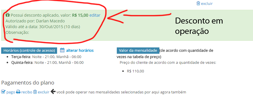 Agora quando uma mensalidade for gerada ou criada, o desconto será aplicado. No plano com desconto, uma mensagem irá aparecer indicando que alguém deu desconto. Por exemplo, um plano com valor R$ 110, com desconto de R$ 30 a mensalidade será de R$80.