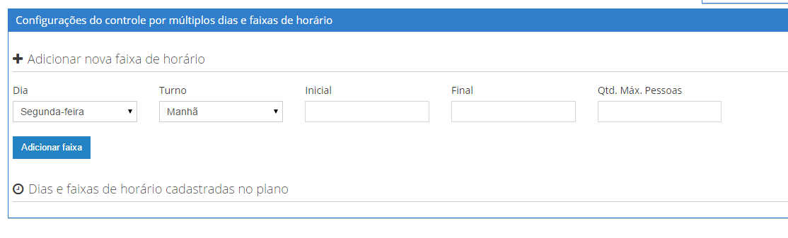 Preencha as informações requisitadas: dia, turno, horário inicial, horário final, quantidade máxima de pessoas e insira a faixa de horário clicando no 'Adicionar faixa'. Após adicionar, a faixa de horário irá aparecer abaixo: