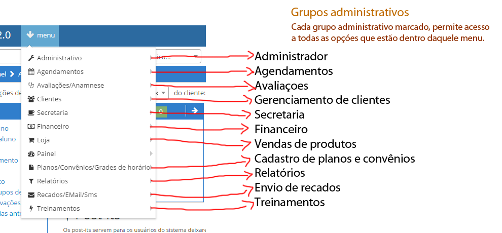 Cada grupo administrativo ativado para um usuário mapeia para um menu e permite fazer todas as operações que estão dentro daquele menu. Por exemplo, o grupo administrativo Gerenciamento de clientes permite todas opções dentro do menu Clientes. Veja a imagem abaixo para ver quais grupos mapeiam para qual menu: