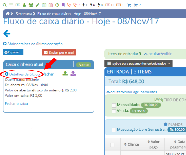 Para saber detalhadamente sobre o caixa que está aberto, clique em "Detalhes da últ. op."