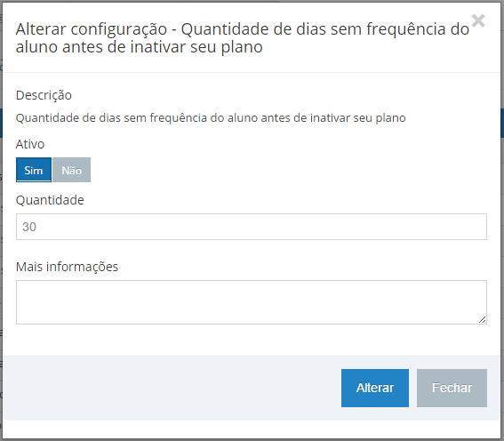 Deixe a configuração ativada(ativo: sim) e preencha o campo 'Quantidade' com a quantidade de dias de antecedência que você deseja que o plano do cliente seja inativado, por exemplo: campo com o valor 30, então após 30 dias sem frequência o plano do cliente será marcado como inativado automaticamente pelo sistema, conforme imagem abaixo: