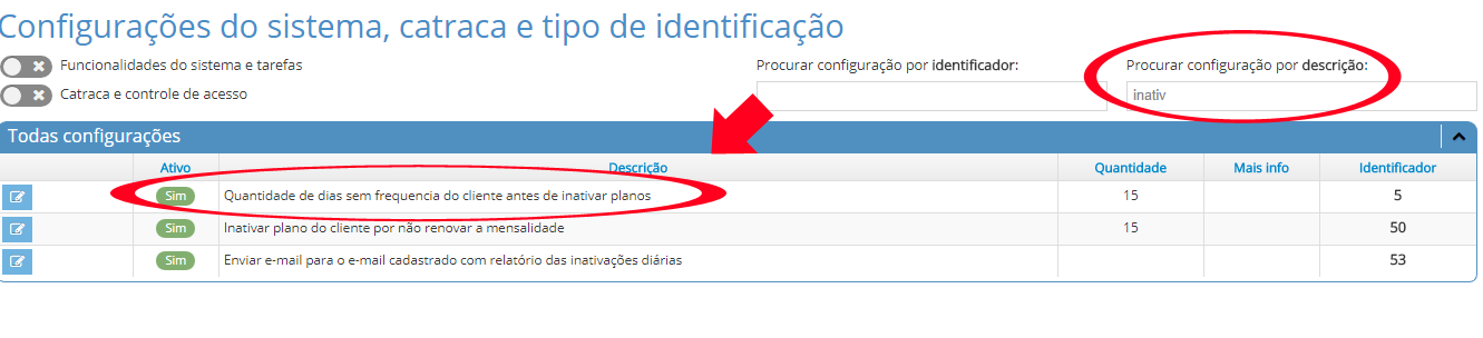Para que o sistema inative automaticamente o plano do cliente que não está mais vindo, ou seja, não está mais tendo entradas registradas no sistema, basta ativar a configuração com identificador 5, conforme imagem abaixo: