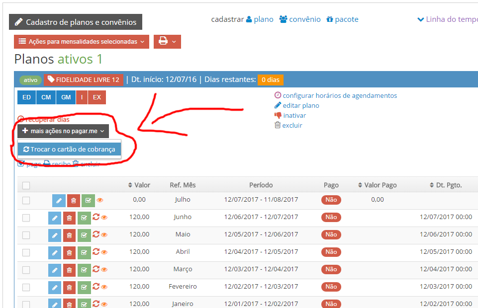 Na seção Planos/convênios, localize o plano que foi ativado com o pagar.me com cobrança recorrente.
