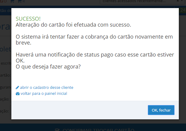 Passo 4 - Ver mensagem de confirmação de sucesso da operação de troca do cartão.