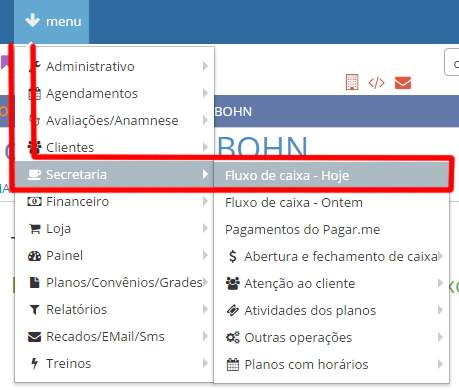 Passo 1 Acessar menu Secretaria > Fluxo de caixa - hoje, como imagem abaixo:
