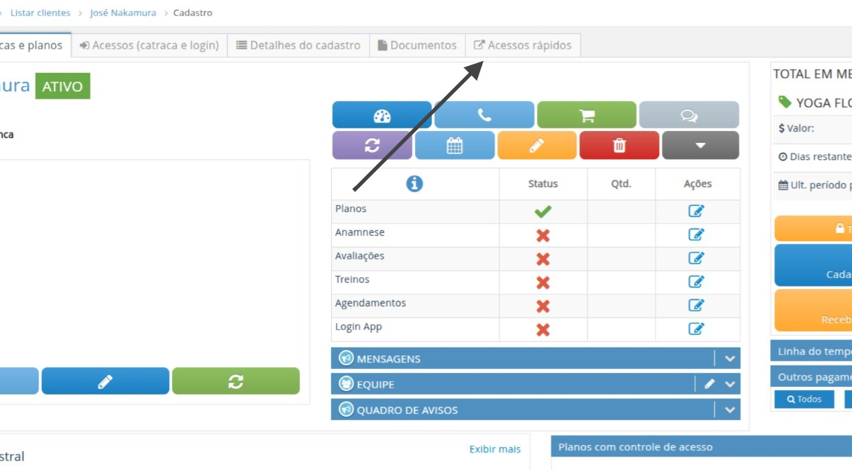 1. Abra o cadastro do cliente que você deseja gerar o contrato e clique em "Acessos rápidos";