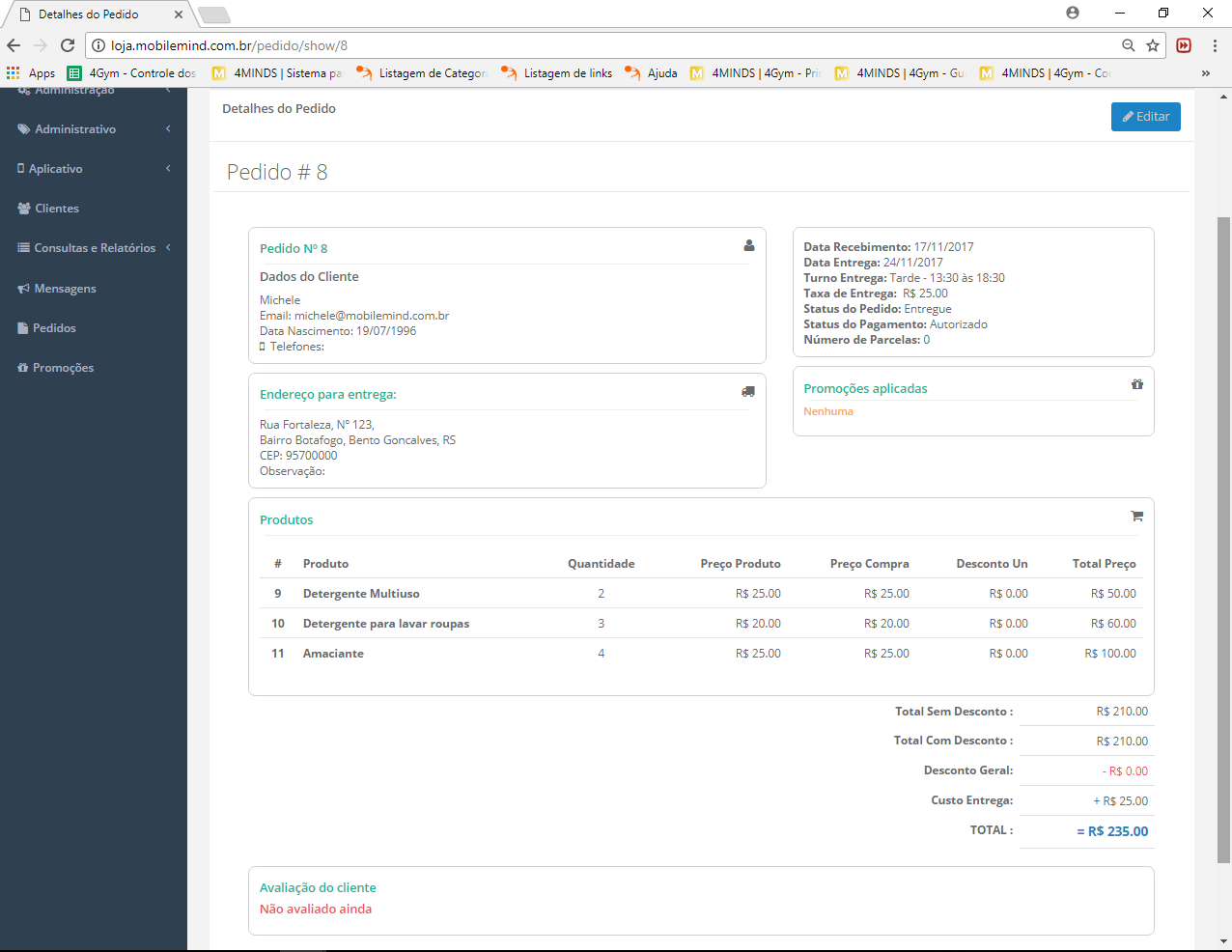 - Entregue: quando o pedido foi entregue ao cliente. Uma avaliação será gerada e enviada ao cliente assim que esse status for informado.