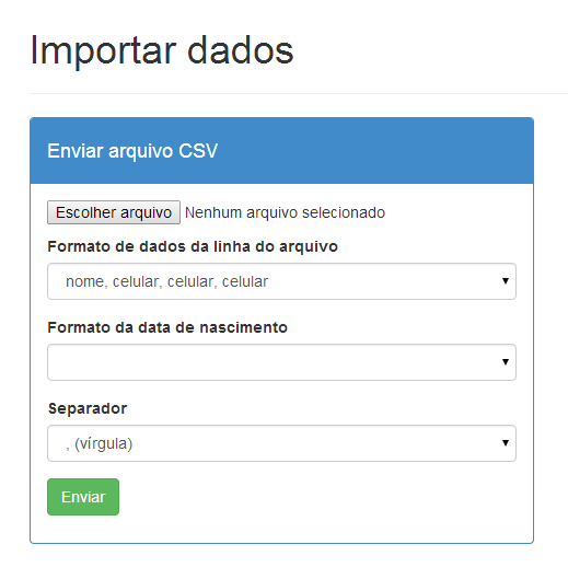Informe aqui o arquivo .csv que você já possui com os contatos exportados. Um assistente para buscar o arquivo em seu sistema de arquivos será iniciado. Navegue até o arquivo e escolha o arquivo correto.