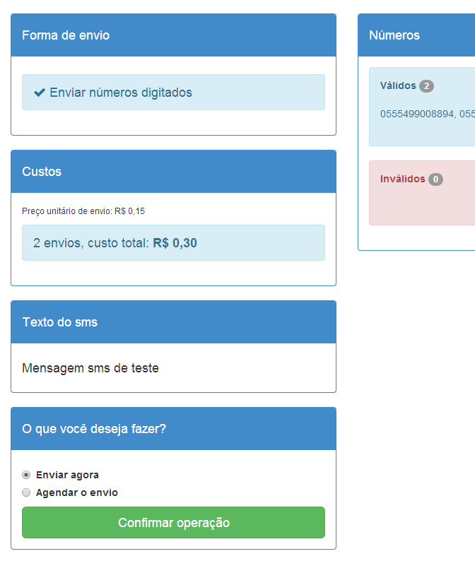 Nessa tela, você deve confirmar as informações de envio como números válidos, o texto da mensagem e o custo.