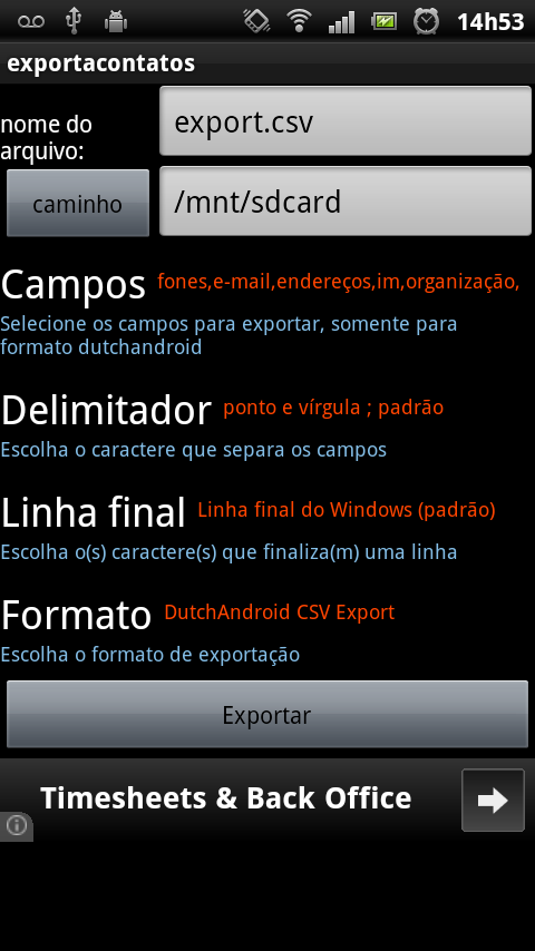 • Passo 2, iniciar o aplicativo e exportar os contatos para arquivo no formato CSV (comma separated values)